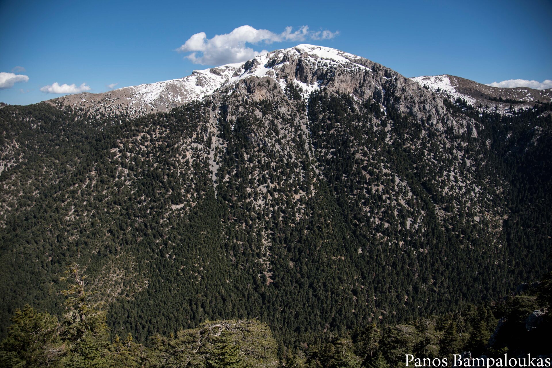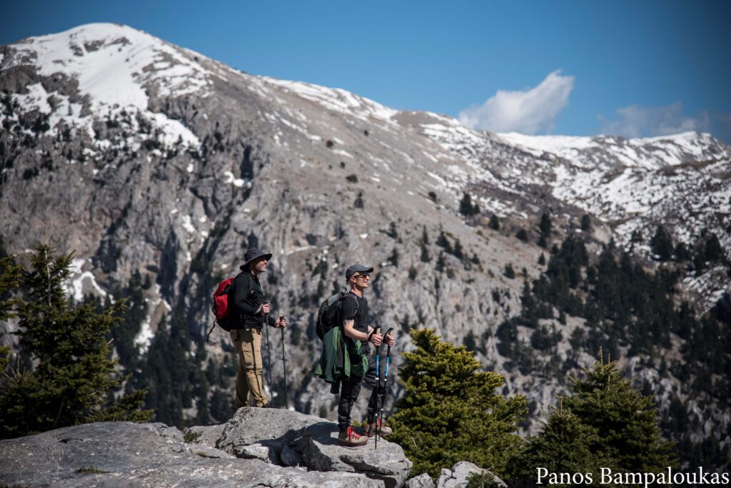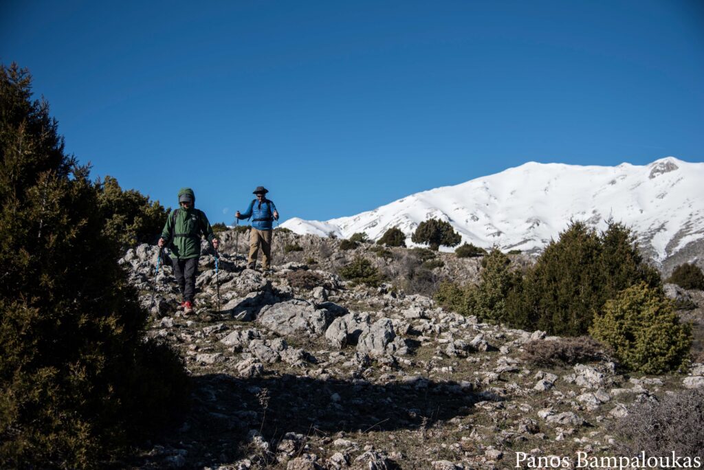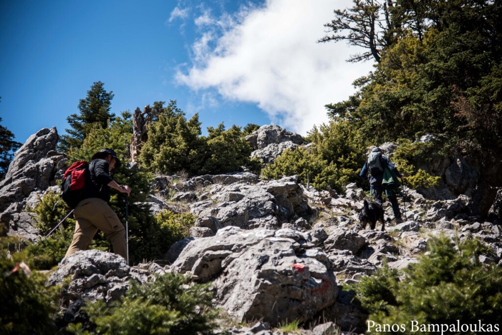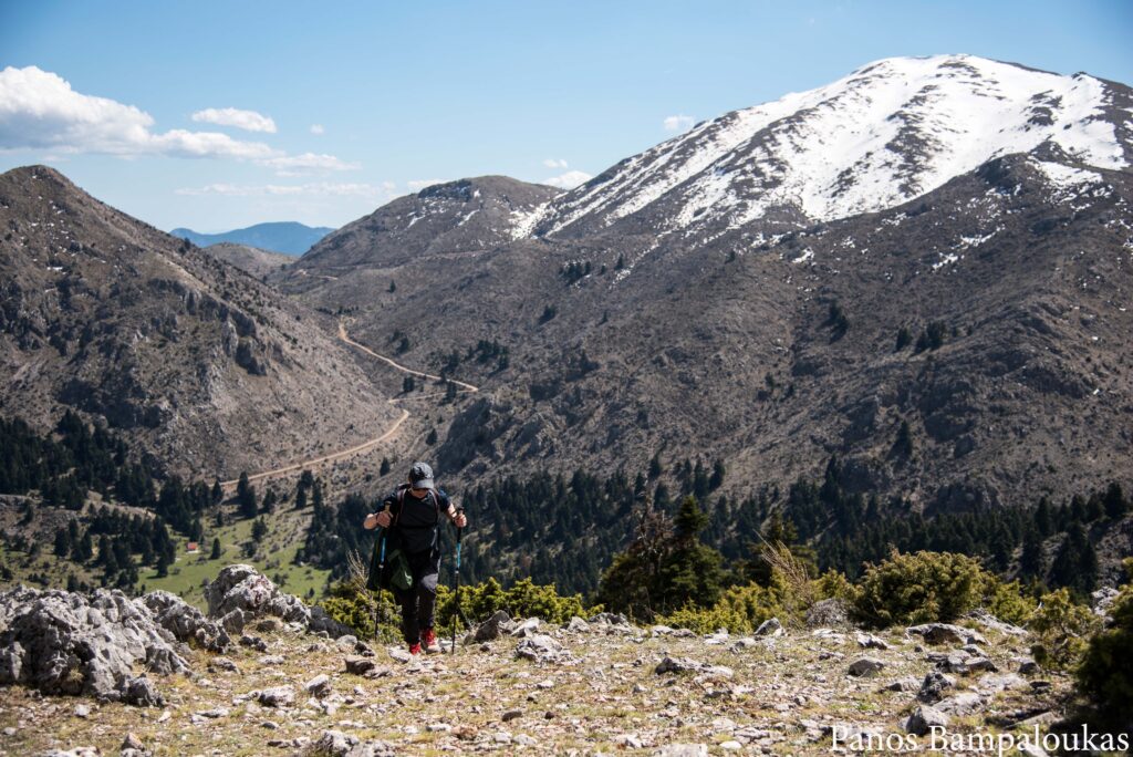 Το μονοπάτι ελίσσεται πάνω σε ήπια κορυφογραμμή με λίγα δέντρα και αρχίζει να κατηφορίζει προς το μετεωρολογικό σταθμό και το ξύλινο κιόσκι. Σε αυτό το σημείο συναντούμε τον ασφάλτινο δρόμο που ανεβαίνει από τα χωριά. Από το κιόσκι φεύγουμε δεξιά προς τα σήματα με το χαρακτηριστικό τρίγωνο.