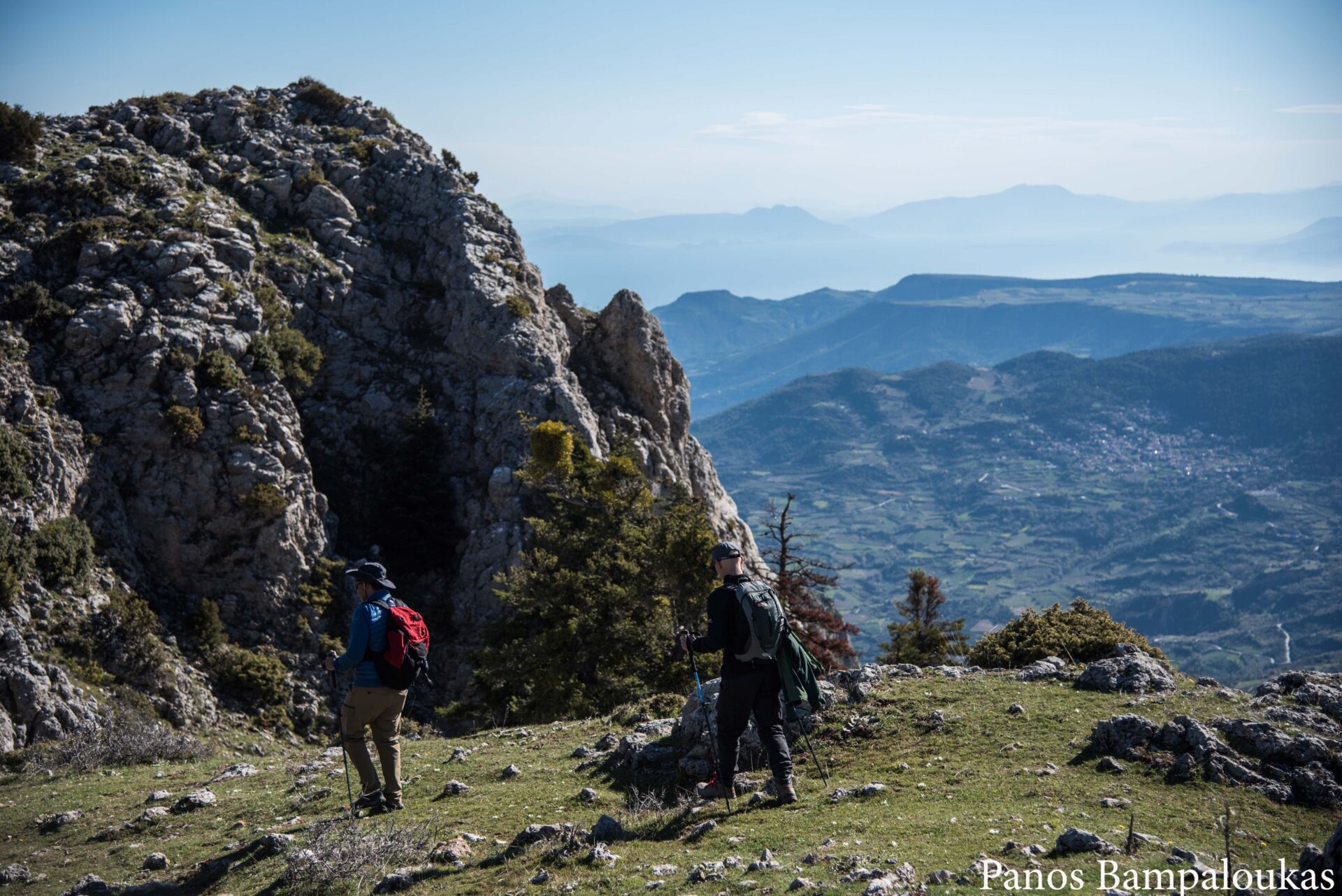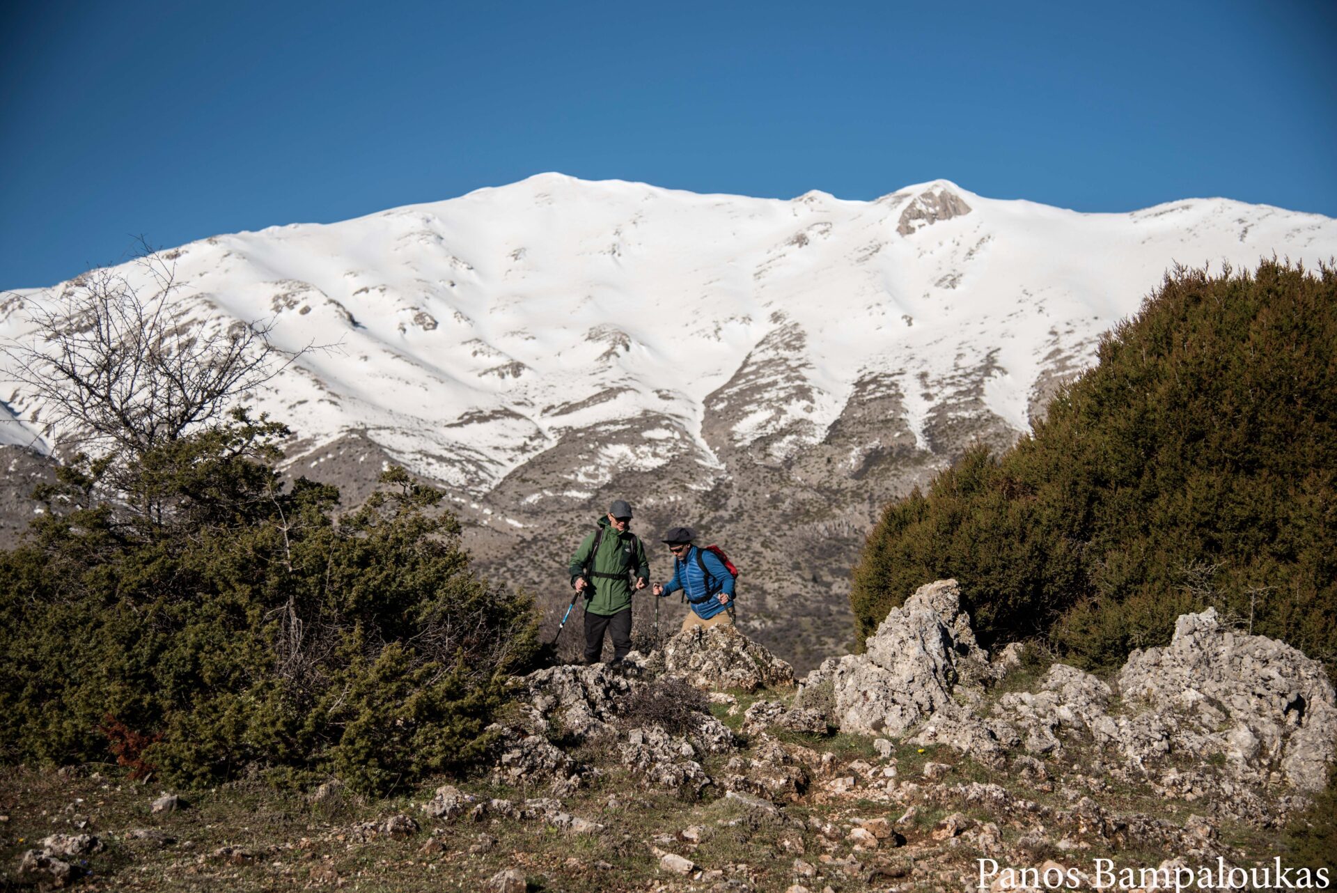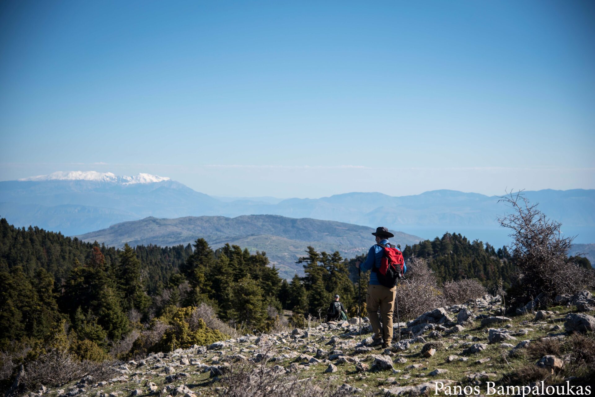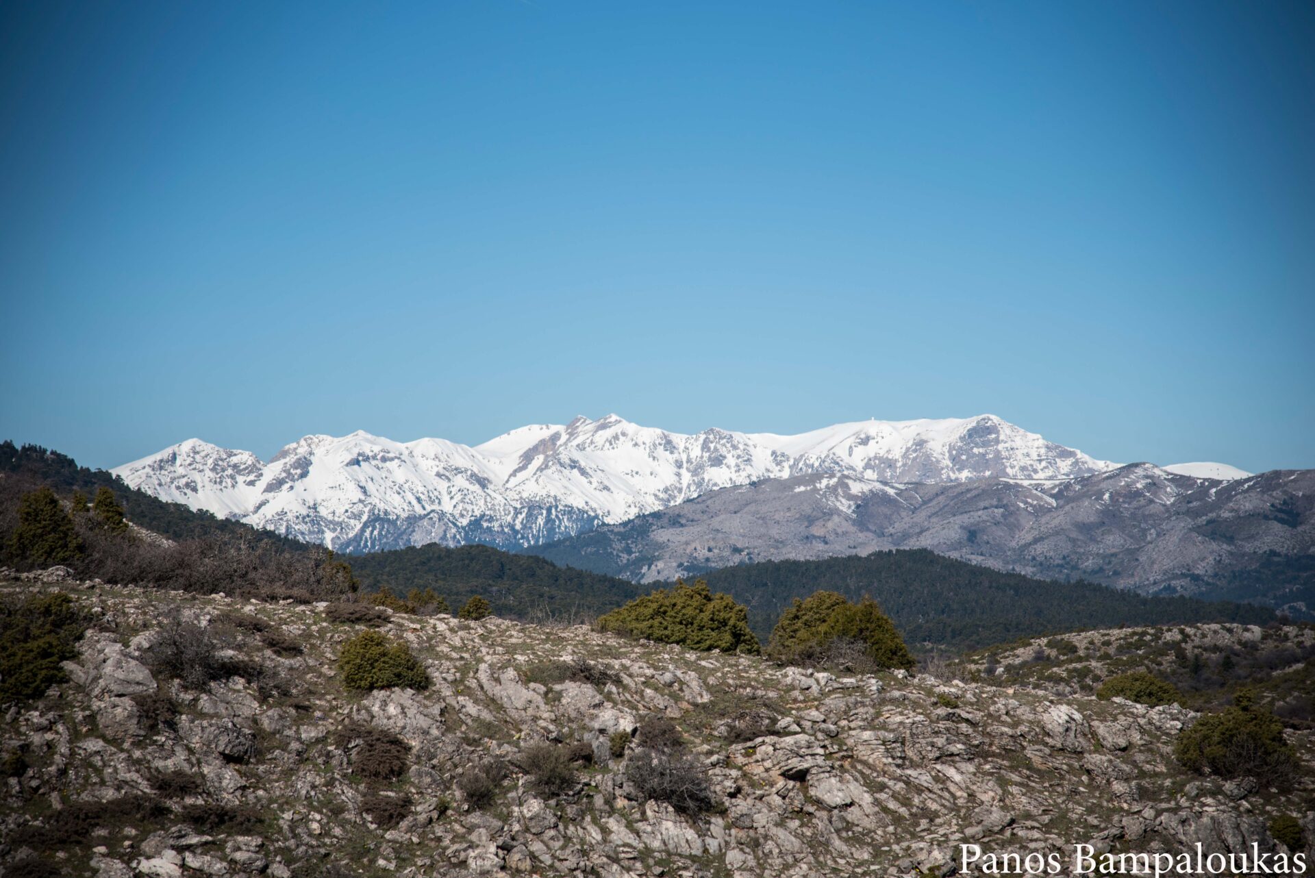Το μονοπάτι ελίσσεται πάνω σε ήπια κορυφογραμμή με λίγα δέντρα και αρχίζει να κατηφορίζει προς το μετεωρολογικό σταθμό και το ξύλινο κιόσκι. Σε αυτό το σημείο συναντούμε τον ασφάλτινο δρόμο που ανεβαίνει από τα χωριά. Από το κιόσκι φεύγουμε δεξιά προς τα σήματα με το χαρακτηριστικό τρίγωνο.