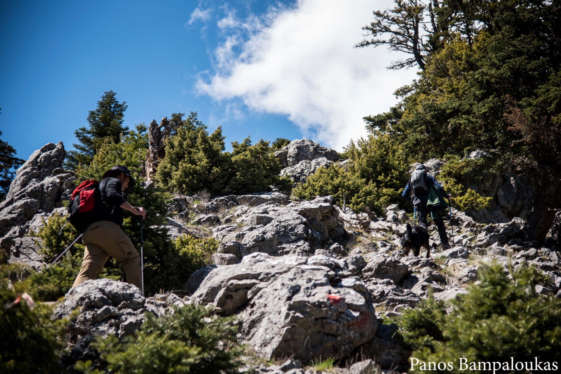 Στο τέλος της κοιλάδας θα περάσουμε δυο φορές το ποταμάκι και θα δούμε μερικά βέλη από μαύρο σπρέι που μας οδηγούν δεξιά προς μια απότομη πλαγιά. Σε αυτό το σημείο θα πρέπει να δείξουμε προσοχή για να μη χάσουμε τη σήμανση. Τα τριγωνικά σημάδια αραιώνουν και πλέον βλέπουμε μπλε σπρέι πάνω στα βράχια. Ακολουθούμε τα σήματα προς τα πάνω μέχρι να βγούμε στο δασικό δρόμο.