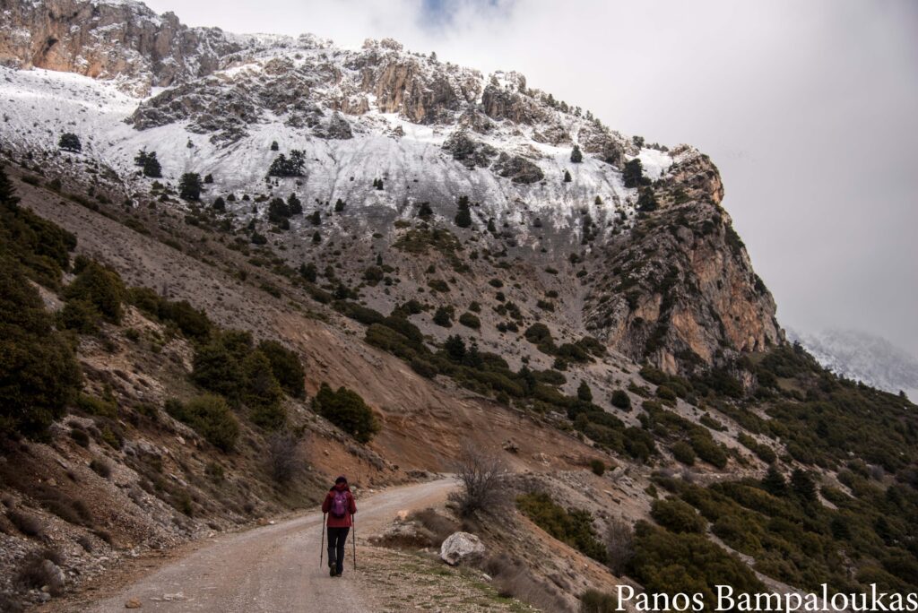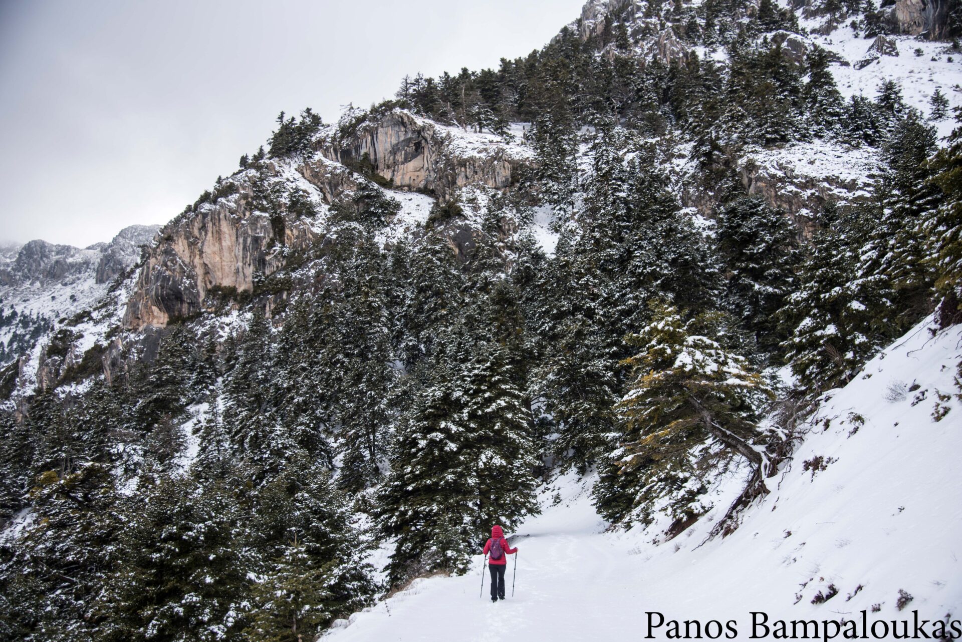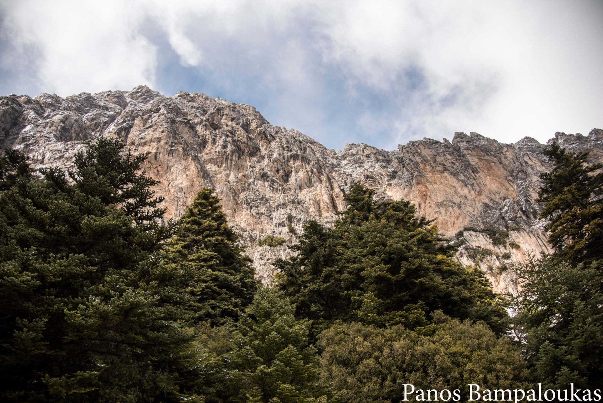 Την αγνοούμε αυτήν την ταμπέλα και συνεχίζουμε το περπάτημα πάνω στον δασικό δρόμο. Ανηφορίζουμε μέχρι τα έλατα έχοντας αριστερά μας επιβλητικούς γκρεμούς. Αρκετά πιο πάνω σε ένα άνοιγμα θα συναντήσουμε έναν δρόμο που συνεχίζει δεξιά προς τα κάτω.