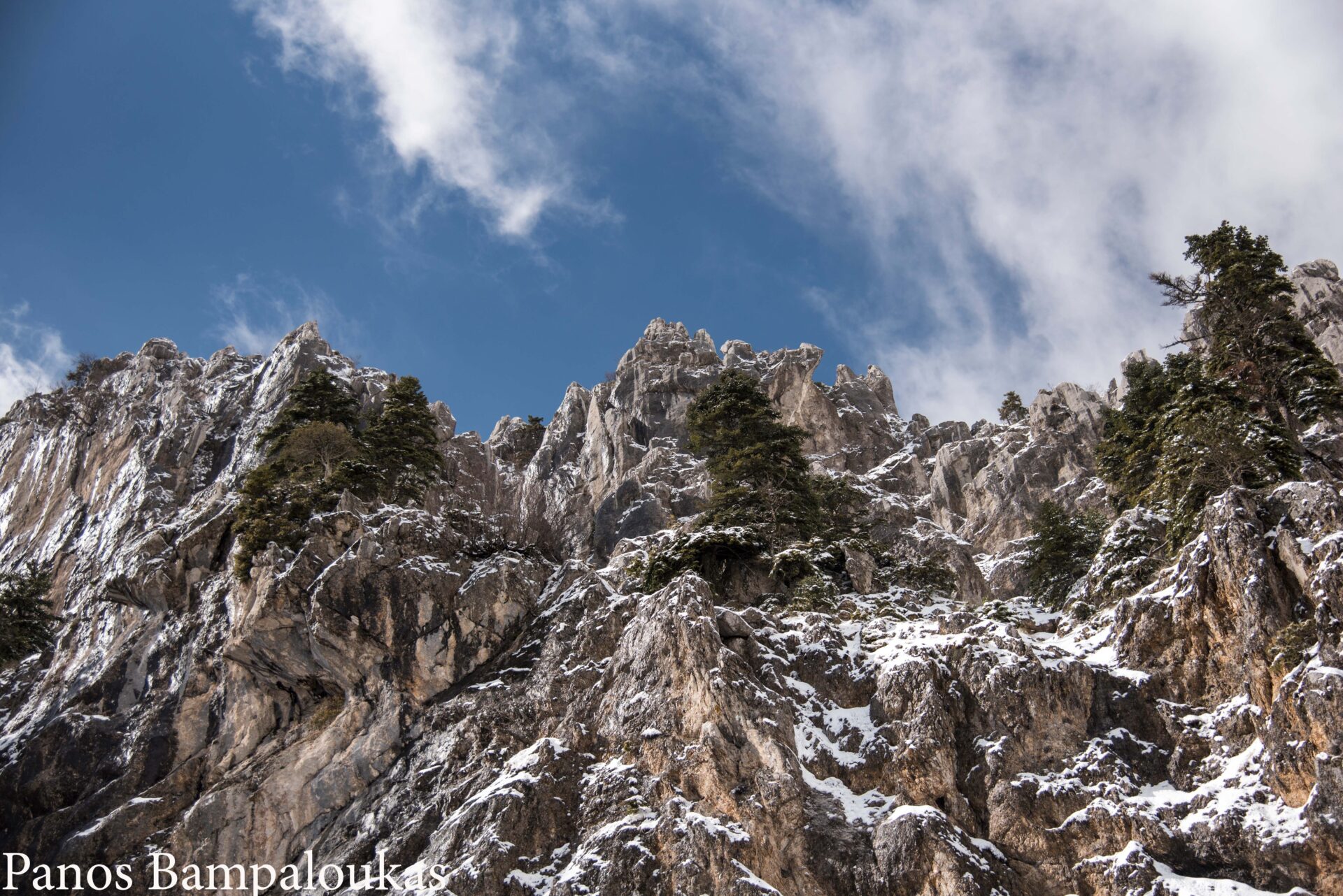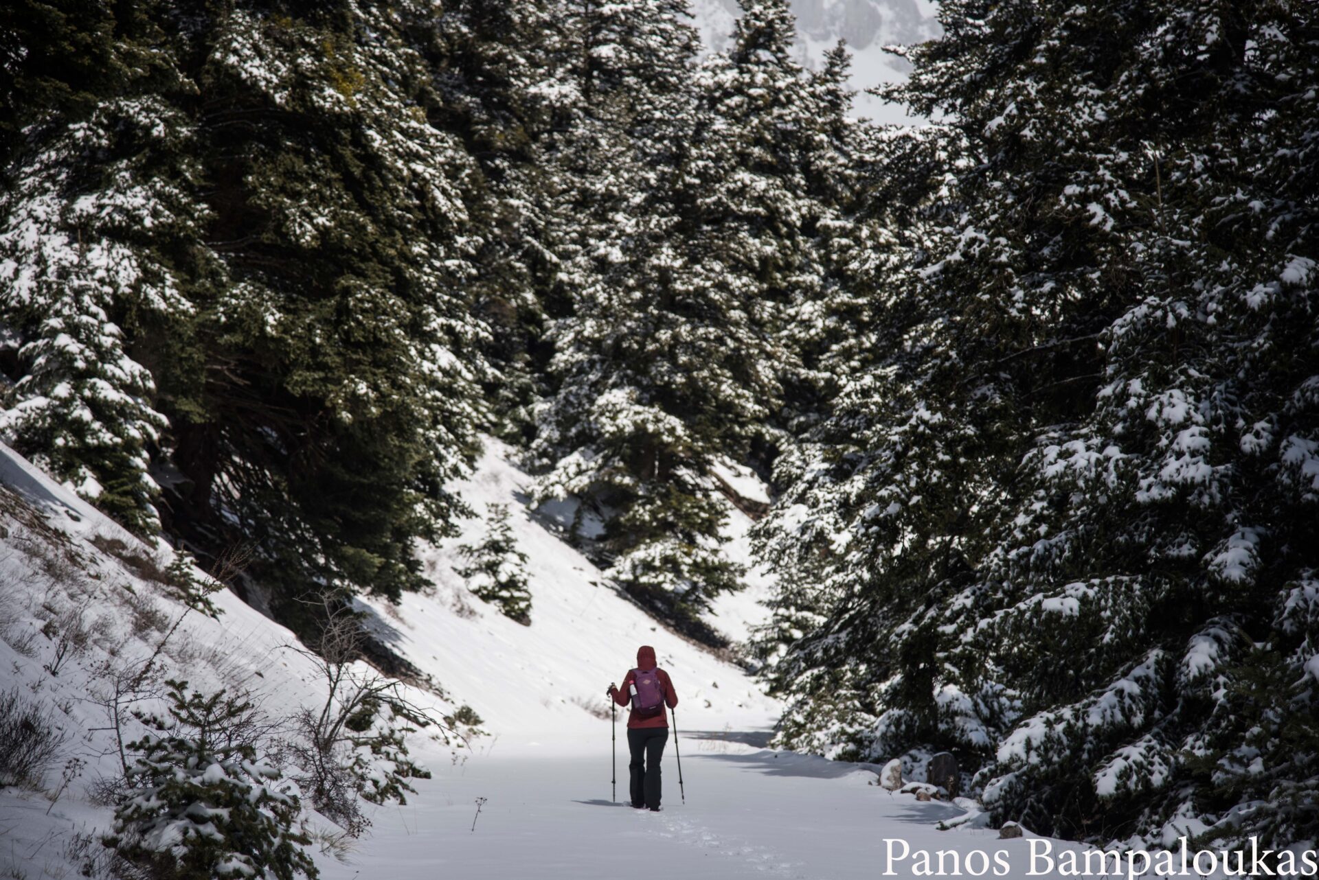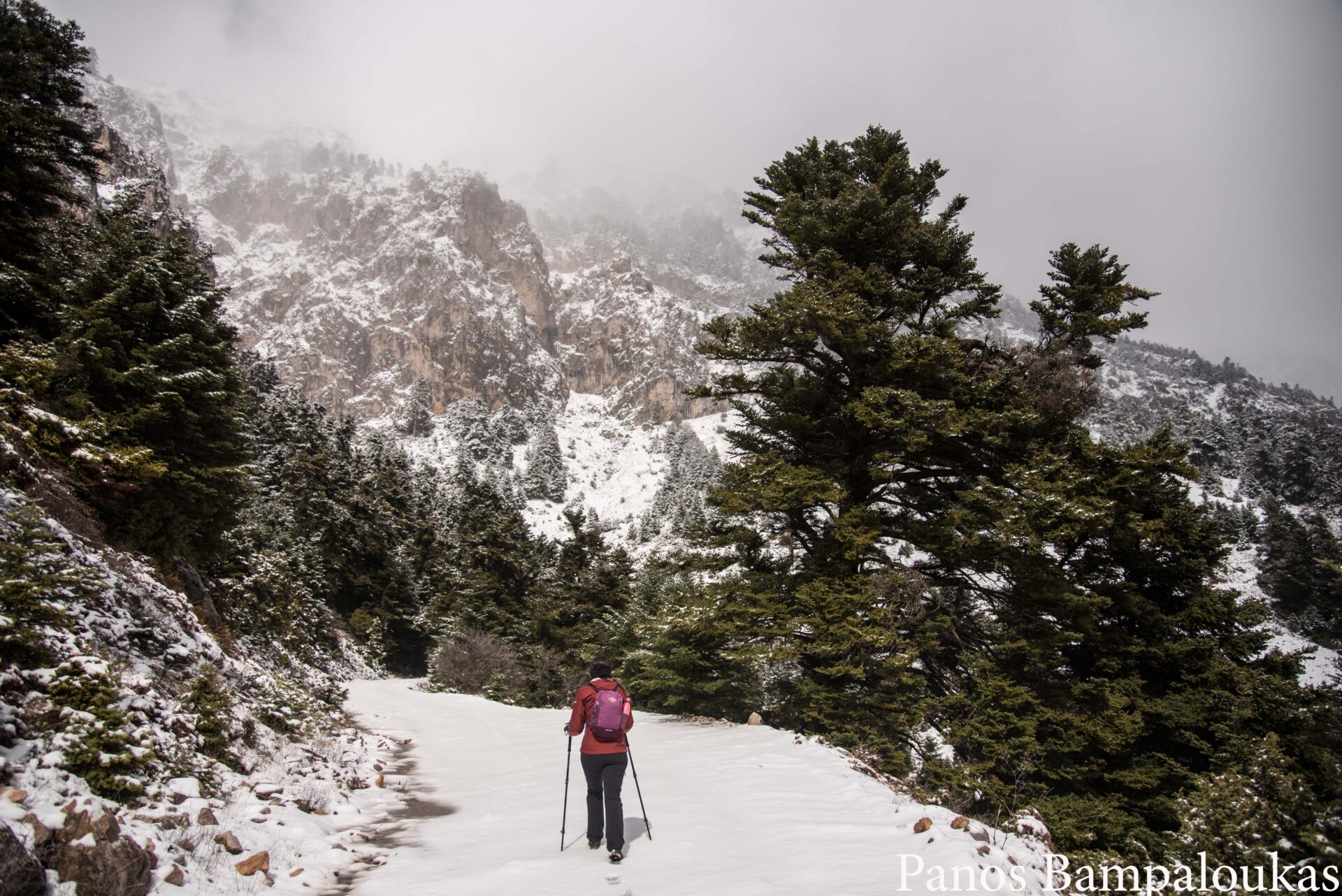 Την αγνοούμε αυτήν την ταμπέλα και συνεχίζουμε το περπάτημα πάνω στον δασικό δρόμο. Ανηφορίζουμε μέχρι τα έλατα έχοντας αριστερά μας επιβλητικούς γκρεμούς. Αρκετά πιο πάνω σε ένα άνοιγμα θα συναντήσουμε έναν δρόμο που συνεχίζει δεξιά προς τα κάτω.
